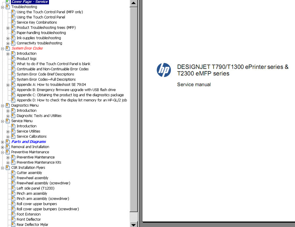 HP Designjet T790, T1300 ePrinters Series and T2300 eMFP Series Service Manual, Parts List and Diagrams and Diagrams This manual contains the necessary information to service the HP Designjet T790, T1300 ePrinters Series and T2300 eMFP Series